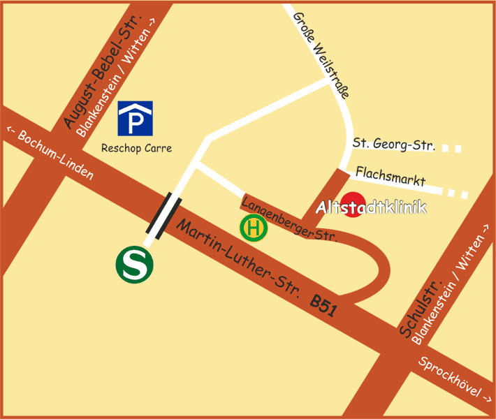 Das nächstgelegene Parkhaus befindet sich am Kaufland Hattingen. Zufahrt über Langenberger Strasse Richtung Busbahnhof (s. Skizze) - dieser liegt dann auf der linken Seite. Von dort sind es nur wenige Gehminuten bis zu unserer Praxis.